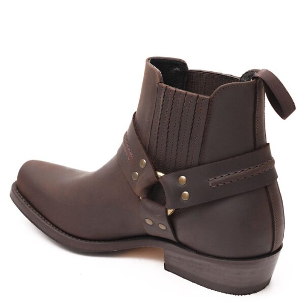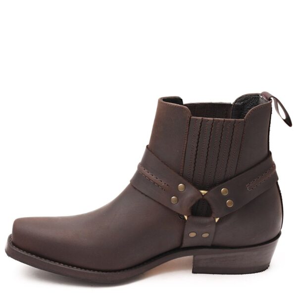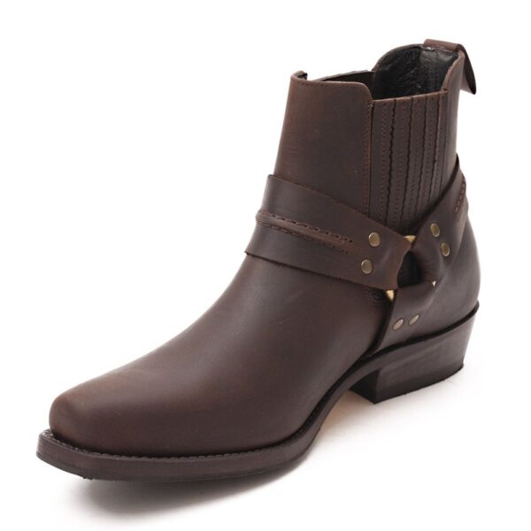 Un botín clásico del estilo Urban Biker que lleva en nuestra colección más de 30 años por su calidad y resistencia. Es un botín realizado en piel de vacuno color Moka. Ideal para llevar con ropa vaquera, cómodos y funcionales para llevar a diario. Uno de los productos estrella. Tiene la puntera cuadrada y a su espuela adornada con una hebilla dorada envejecida. Consta con unos elásticos laterales, para facilitar su calzado, recubiertos en piel. La suela es de cuero natural y el tacón va protegido con una tapa de caucho lo que le proporciona confort y seguridad. Su fabricación es artesanal por eso es un botín de CALIDAD que respeta tanto el medio ambiente como tus pies. La fabricación Goodyear de doble cosido le da una alta resistencia y respeta la forma anatómica de la planta de los pies. Su cuidado es sencillo pues sólo necesita limpiar con un trapo de algodón humedecido y lustrada con grasa de caballo.